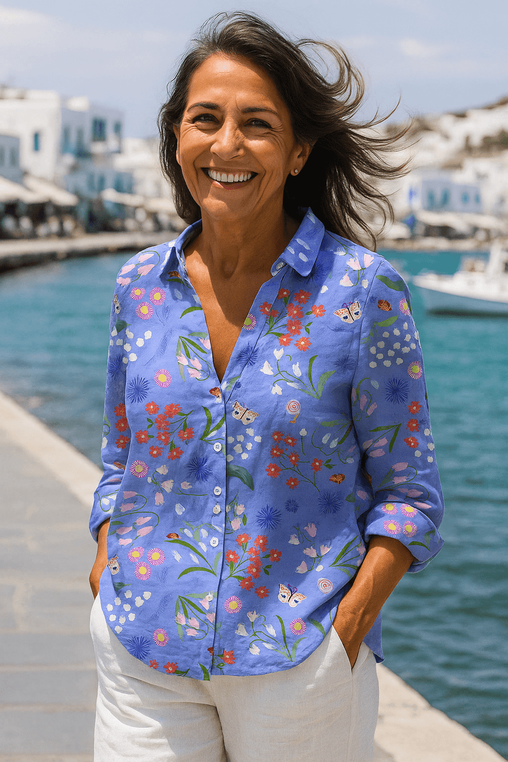 Introducing the Felicia | Bloom Meadow Blouse, a vibrant piece that beautifully embodies the essence of spring. Adorned with delicate flower prints, butterflies, and ladybugs on a soft blue backdrop, this blouse is light and airy—perfect for casual days, garden parties, or adding a cheerful touch to your everyday style.